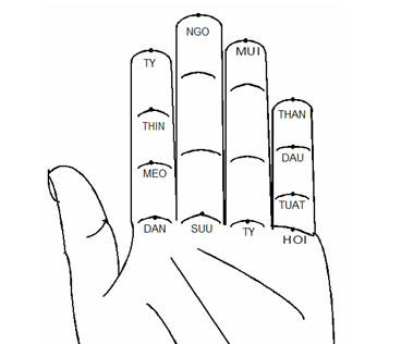 Xác định 2 số cuối của năm cần tìm gần với bội số nào nhất của 12 ( bội số của 12 như đã tính từ trước gồm 0, 12, 24, 36, 48, 60, 72, 84, 96 ). Rồi từ cung khởi ta di chuyển ngón tay cái qua các cung trên bàn tay trái theo chiều thuận hay nghịch để đến cung Địa Chi cần tìm.